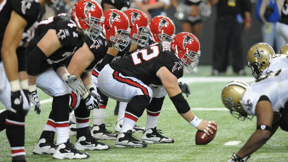 Atlanta’s inaugural uniforms featured red helmets with their original logo on the sides, as well as a stripe down the center that borrowed its colors from in-state schools Georgia and Georgia Tech. They were paired with black or white jerseys with the same logo on the sleeves, white pants with a traditional striping pattern down the sides and black socks with stripes that matched the pants.
