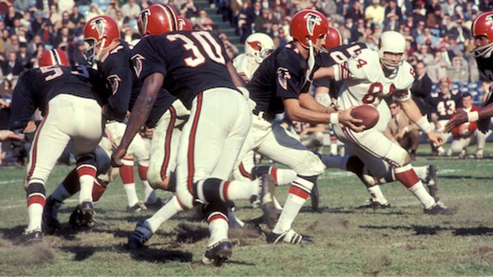 That look lasted just one season, as the Falcons replaced the logo on the sleeves with stripes and TV numbers. They then scrapped their black home jerseys and matching socks for red jerseys and socks in 1971, and that remained their primary home design until 1978, when they introduced silver pants, as well as silver numbers and stripes on their red home jerseys.