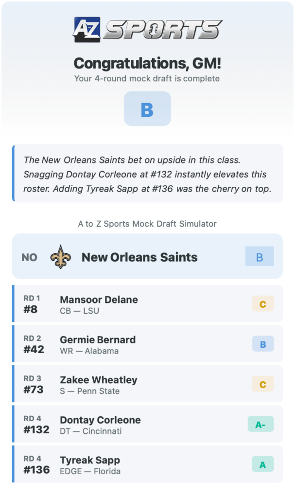 The A to Z Sports NFL mock draft simulator offers a deeply customizable and data-driven experience with never-before-seen features. Try the mock draft simulator today, before the 2026 NFL Draft arrives!