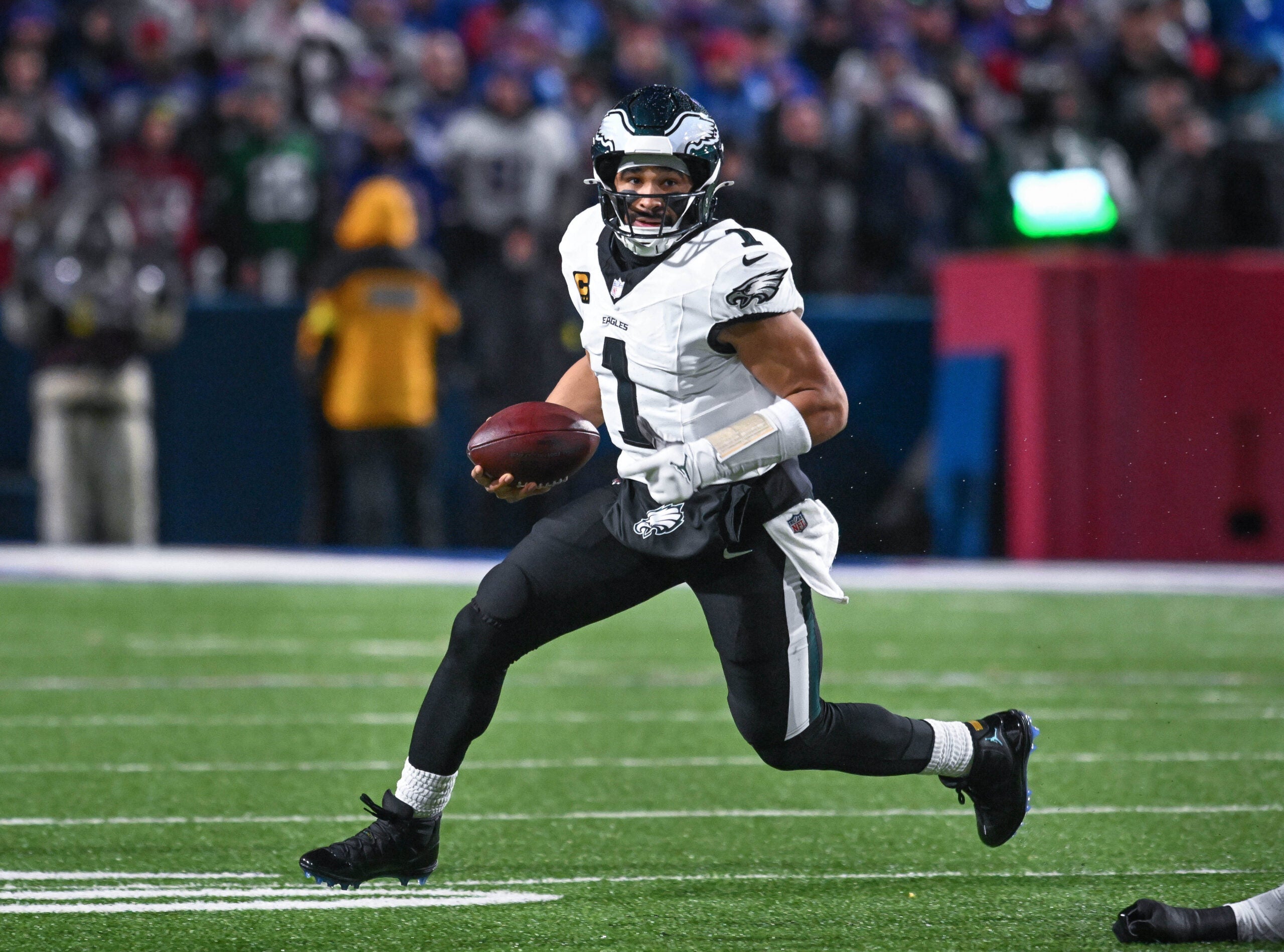Dec 28, 2025; Orchard Park, New York, USA; Philadelphia Eagles quarterback Jalen Hurts (1) runs out of the pocket against the Buffalo Bills in the second quarter at Highmark Stadium. Mandatory Credit: Mark Konezny-Imagn Images