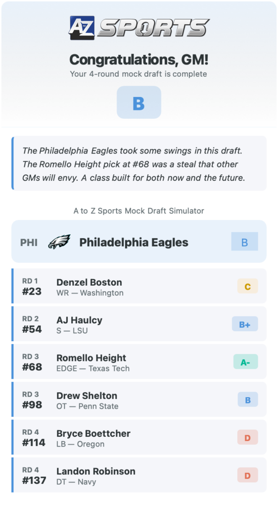 A to Z Sports has launched its brand new mock draft simulator, and we’re celebrating with a new Eagles mock draft.