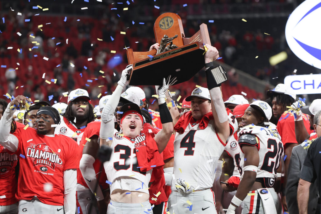 Dec 6, 2025; Atlanta, GA, USA; Georgia Bulldogs running back Cash Jones (32) and Georgia Bulldogs tight end Oscar Delp (4) lift the SEC Championship trophy after the game against the Alabama Crimson Tide during the 2025 SEC Championship game at Mercedes-Benz Stadium. Mandatory Credit: Brett Davis-Imagn Images