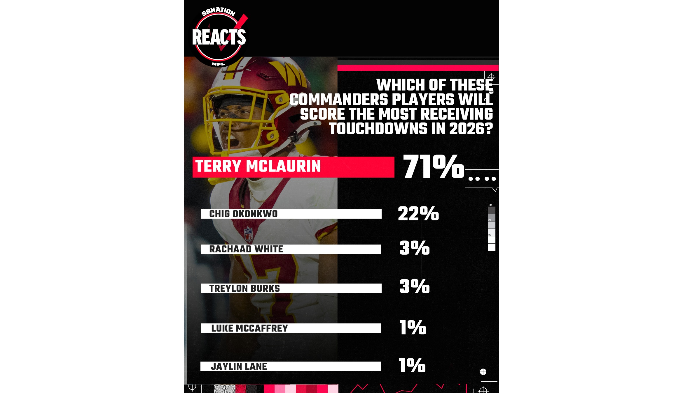 Of course, 22% of respondents in our survey pointed to Chig Okonkwo, who will be working with a quarterback with a demonstrated love of tight ends, to out-produce Terry in ’26. Maybe that will happen, though it will almost certainly require Okonkwo to at least double the previous best single-season TD production of his career. Zach Ertz’ 7 touchdown catches in ‘24, the most of his career outside of 2017-18, argue that Chig could achieve that kind of scoring production with Jayden Daniels throwing the ball.