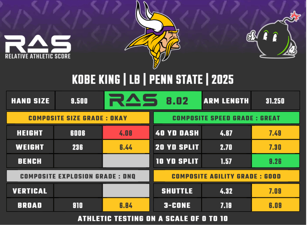 King recorded an 8.02 RAS score, which is just enough to be colored green for the “elite” tier of RAS. However, when you look at the individual drills, you see that he’s merely a little above average in all of them rather than having dynamic speed, explosion, or agility.