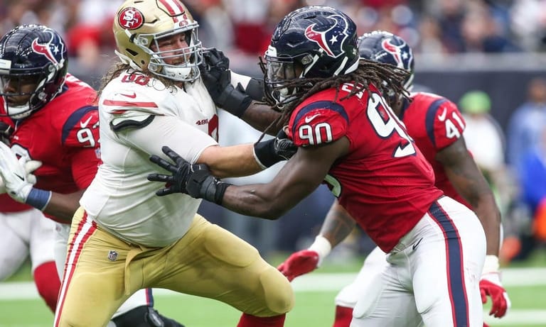 Dec 10, 2017; Houston, TX, USA; Houston Texans outside linebacker Jadeveon Clowney (90) applies defensive pressure against San Francisco 49ers offensive guard Zane Beadles (68) during the game at NRG Stadium. Mandatory Credit: Troy Taormina-USA TODAY Sports