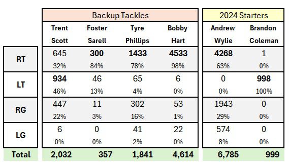 Of the four backups, Scott is the only one to have played in games for the Commanders. He has shown surprising flexibility in his NFL career by playing at least 440 snaps at three different positions. If we look at only the tackle position, he has 1,579 career snaps, with 59% played at left tackle and 41% at right tackle.