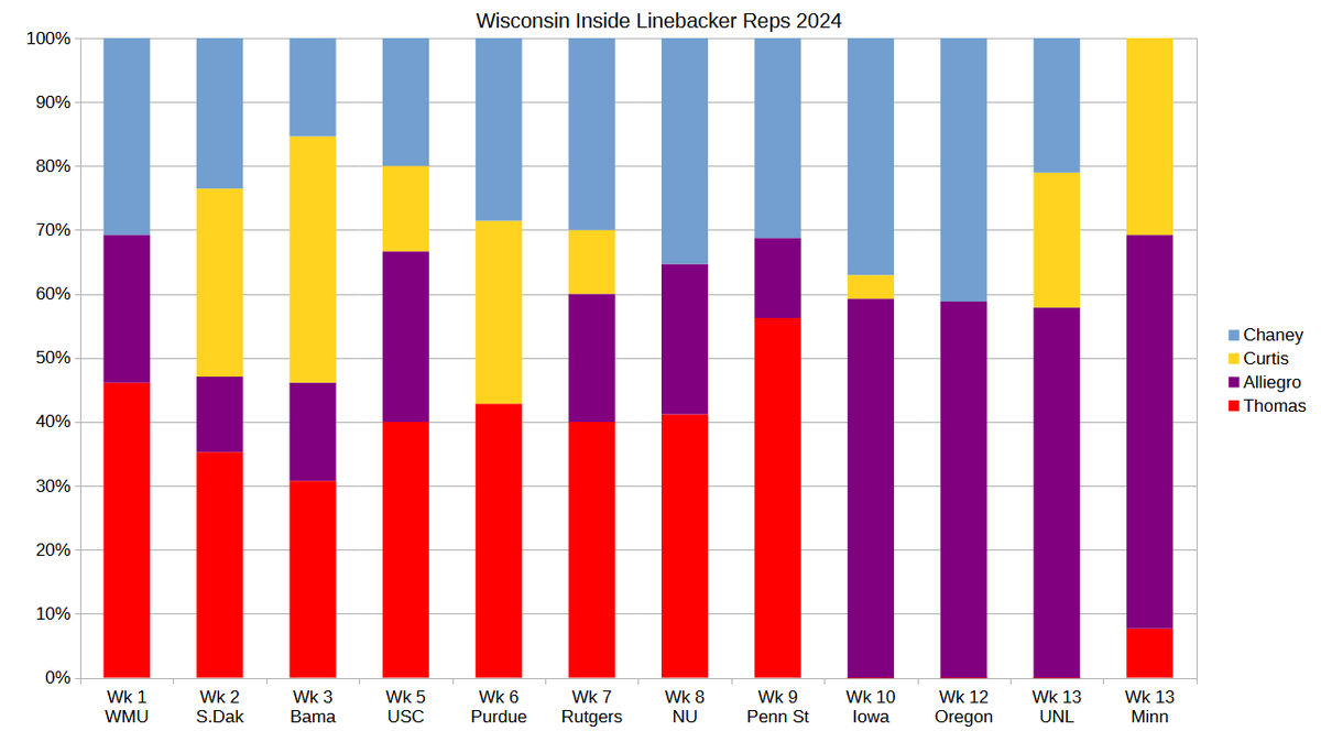 Wisconsin used four inside backers in the rotation, though some injuries and unavailabilities distorted the playing time numbers. I thought it was clear from reviewing the tape of the whole season that the Badgers preferred to play Jaheim Thomas, who had originally been with Fickell’s staff at Cincinnati then left for Arkansas during the transition and rejoined his old coach last year. I’d say the other preferred starter was the solid rotational member for the last three seasons, Jake Chaney, though injuries to Thomas then Chaney brought a substantial increase in playing time for then-redshirt freshman #28 ILB Alliegro in the last month of the season. The second transfer into the room last year, #4 ILB Curtis from USC, was the most talented on paper as a mid 4-star in the 2023 cycle and had played as a true freshman in Los Angeles so he was given a shot with a good deal of meaningful rotational time in the first few weeks, but his grades on my tally sheet were quite poor and he essentially disappeared until the last two weeks when the injury situation made the Badgers go back to him. This chart maps out the playing time to illustrate the changing situation: