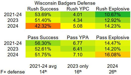 I spent the first ten paragraphs of last year’s preview on the defense explaining why I thought Wisconsin was the rare instance of F+ advanced statistics getting fooled in 2023, because their 16th placed ranking in that formula didn’t match up at all with my observations or come anywhere close to their grades from charting. My analytical model would have had them in the 40s instead, with average performances in most categories and a very worrying reversal in redzone performance. I thought they were in for a continuation of the efficiency slide in 2024 from what was a top ten defense under former DC Jim Leonhard since they continued to hemorrhage linemen, and that’s exactly what happened. While I suppose it’s validating that F+ caught on a bit by dropping the Badgers ten ranks I still don’t understand what the hang-up is since on all the same metrics they’d be in the 50s for me.