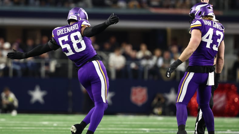 Dec 14, 2025; Arlington, Texas, USA; Minnesota Vikings linebacker Jonathan Greenard (58) and Minnesota Vikings linebacker Andrew van Ginkel (43) celebrate after a play during the first half against the Dallas Cowboys at AT&T Stadium. Mandatory Credit: Kevin Jairaj-Imagn Images