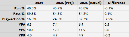 From a macro, team-wide perspective, the model did a solid job capturing overall offensive growth. The biggest miss came in play-action rate, where the Bears didn’t just increase usage… they nearly doubled it from 2024 to 2025.