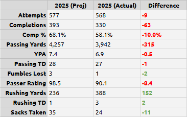 The main areas to focus on here are completion percentage, passer rating, and sacks as far as missed projections are concerned.