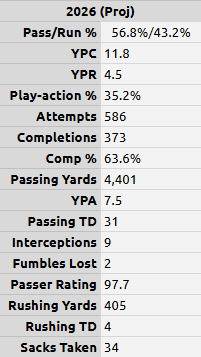 This version leans into what we actually saw, a stronger emphasis on explosive plays over low-yield, “empty calorie” passing, a play-action rate pushing close to 35%, and the natural progression you expect from both a quarterback and an offense entering year two in the same system. (And based on everything we’ve covered in this series, progression is something we should absolutely expect.)