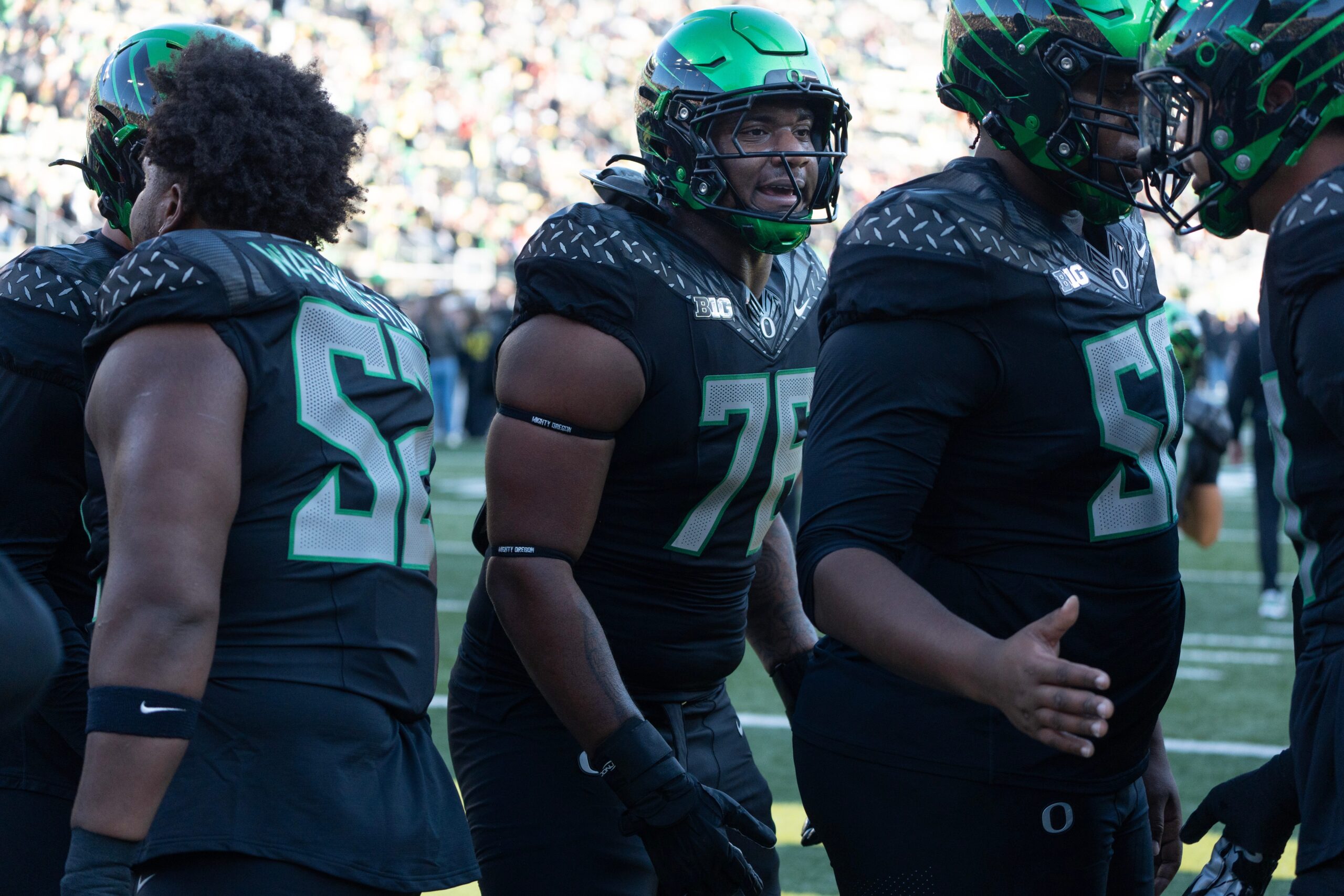 Oregon’s Isaiah World, center, greats fellow players before the game against Southern California Nov. 22, 2025.