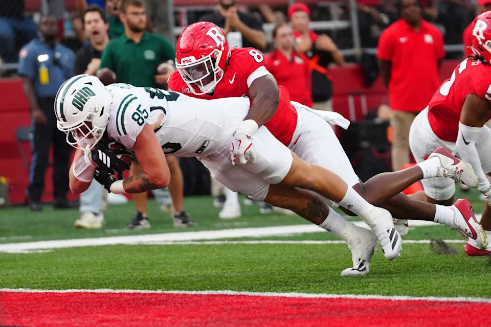 Ohio Bobcats tight end Mason Williams (85) scores the first touchdown for his team despite efforts by Rutgers Scarlet Knights defensive lineman Jordan Walker (8) Thursday, August 28, 2025.