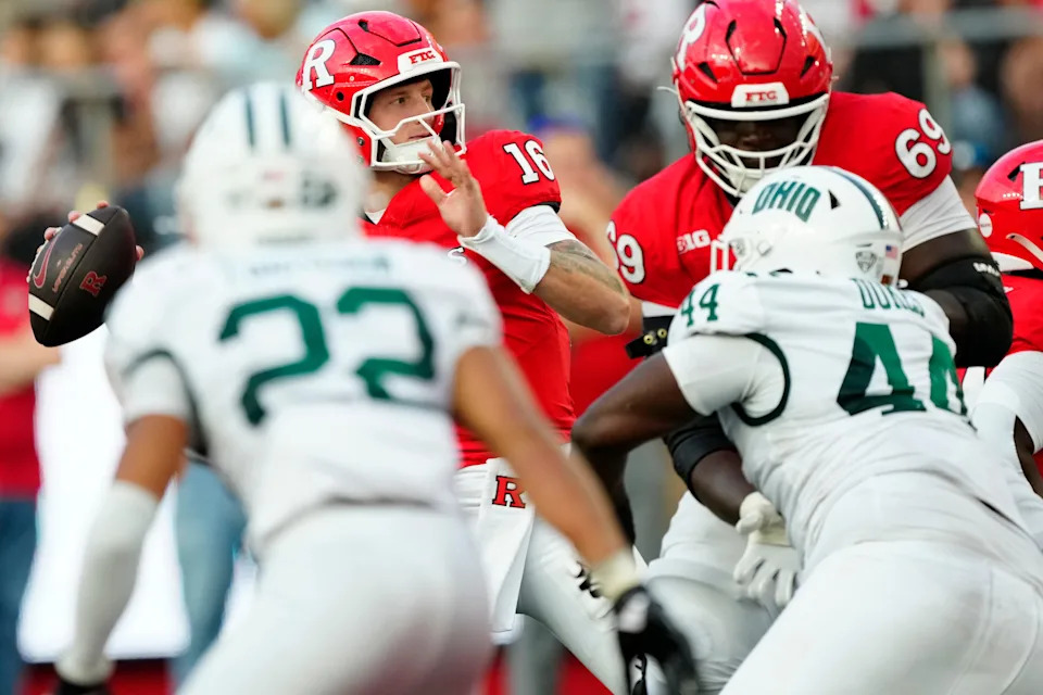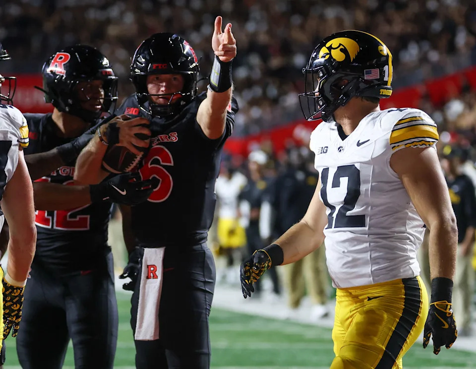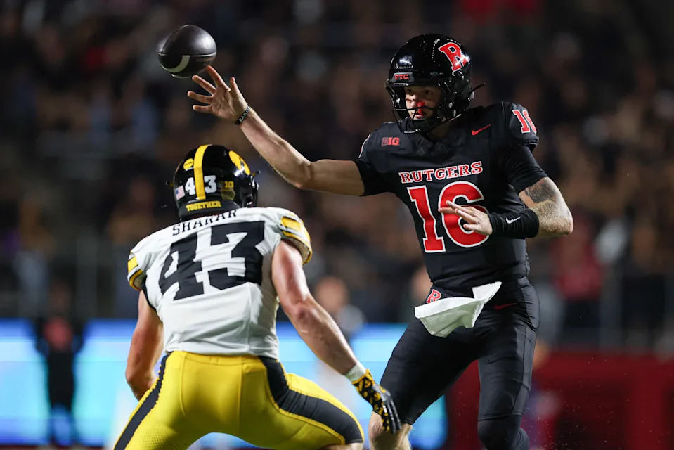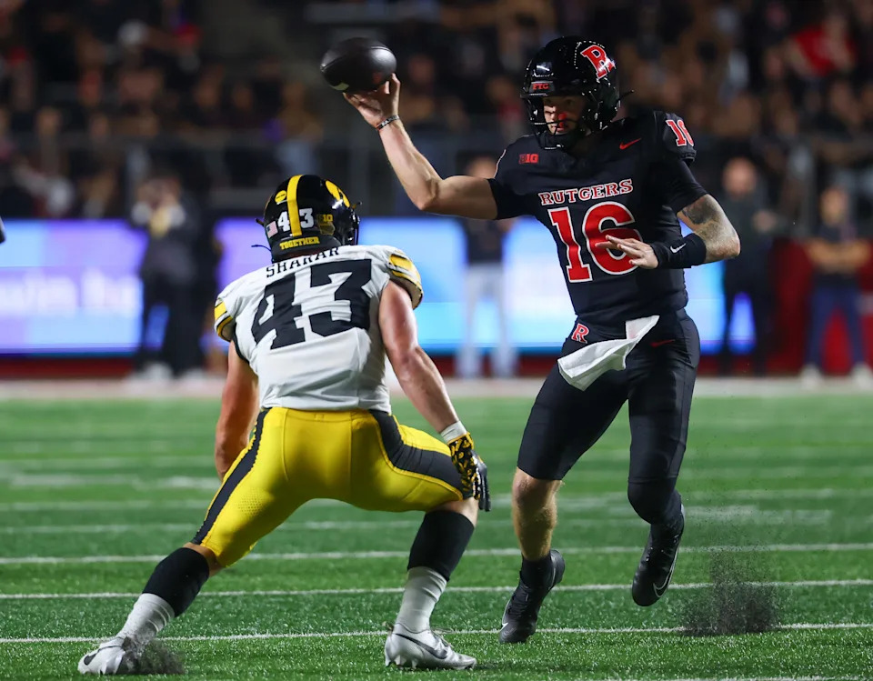 PISCATAWAY, NEW JERSEY – SEPTEMBER 19: Athan Kaliakmanis #16 of the Rutgers Scarlet Knights throws a pass while under pressure from Karson Sharar #43 of the Iowa Hawkeyes during the first half at SHI Stadium on September 19, 2025 in Piscataway, New Jersey. (Photo by Ed Mulholland/Getty Images)