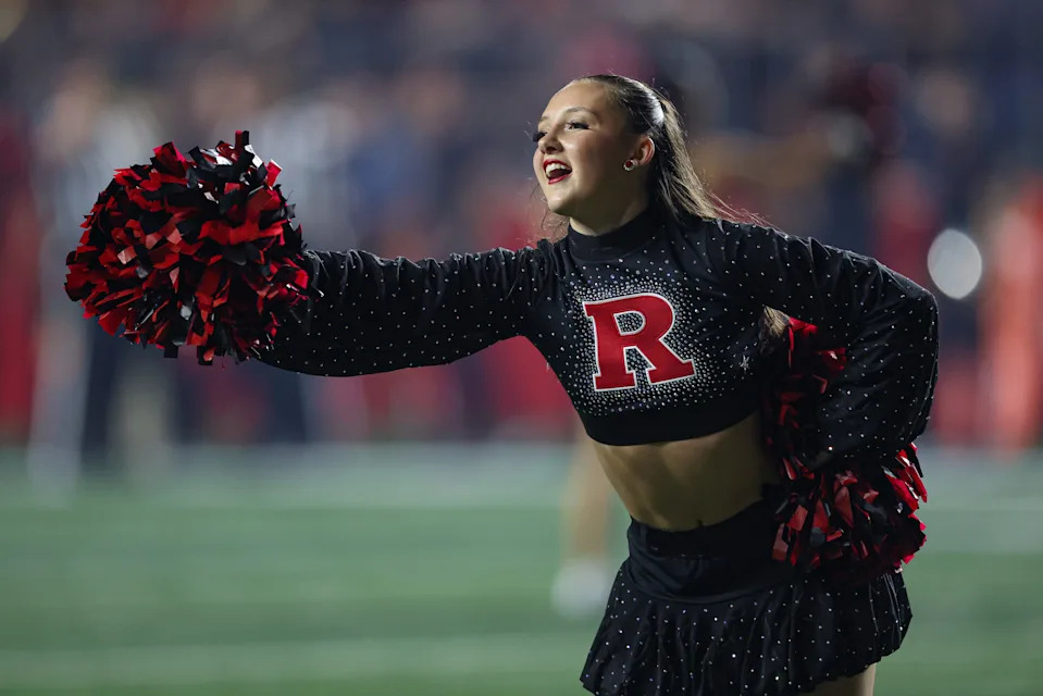 Sep 19, 2025; Piscataway, New Jersey, USA; A member of the Rutgers Scarlet Knights cheer team performs during the first half of the game against the Iowa Hawkeyes at SHI Stadium. Mandatory Credit: Vincent Carchietta-Imagn Images