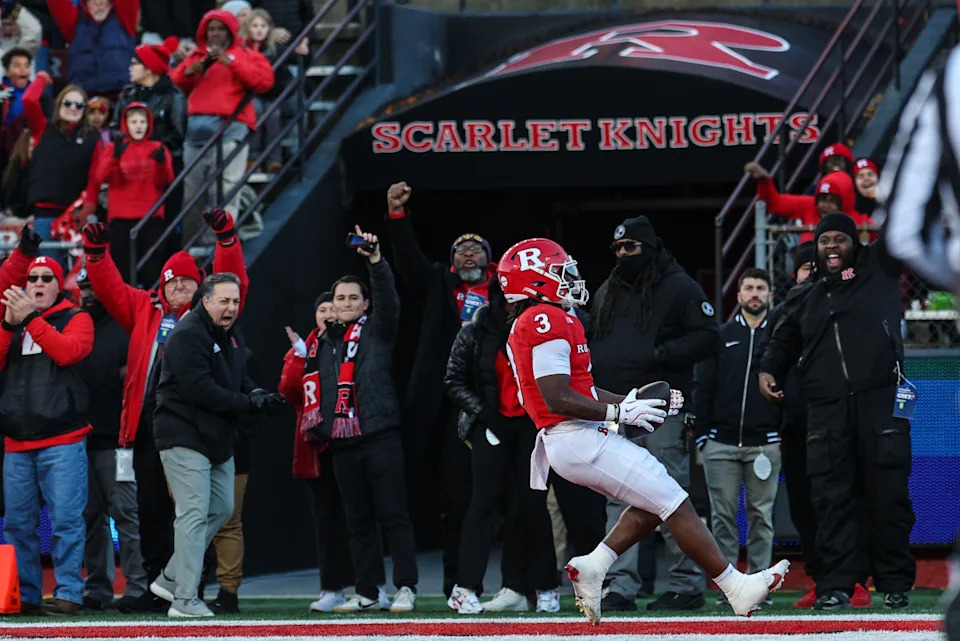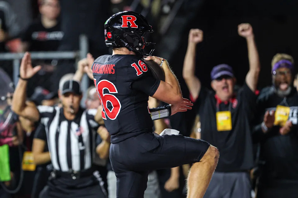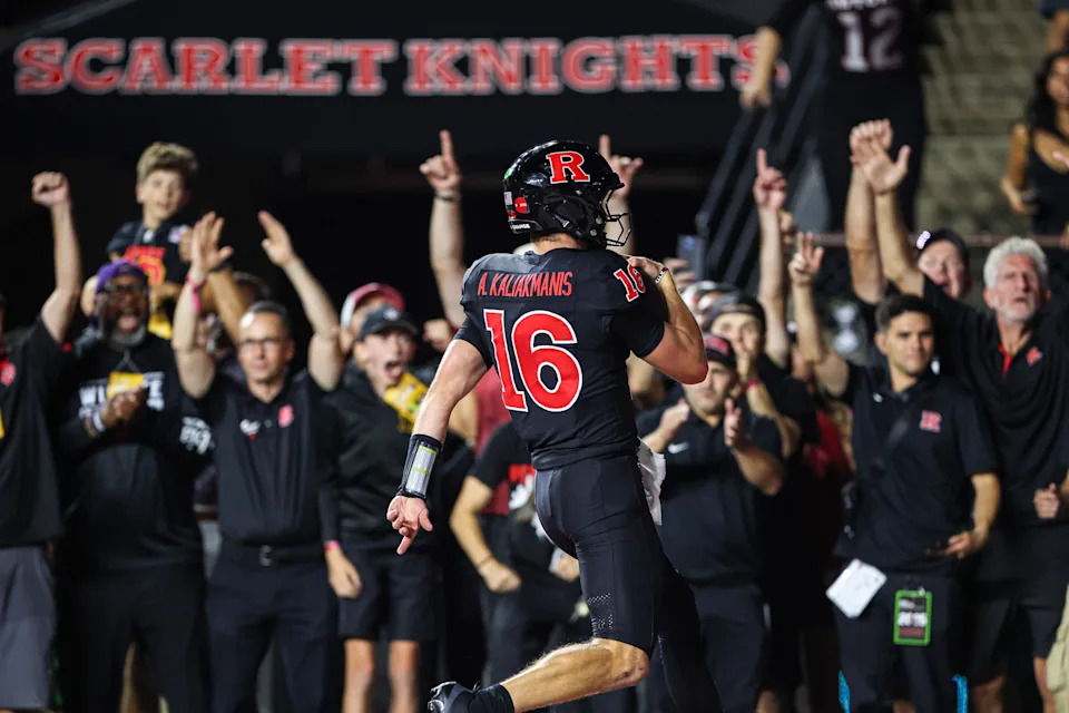 PISCATAWAY, NEW JERSEY – SEPTEMBER 19: Athan Kaliakmanis #16 of the Rutgers Scarlet Knights signals a first down against the Iowa Hawkeyes during the first half at SHI Stadium on September 19, 2025 in Piscataway, New Jersey. (Photo by Ed Mulholland/Getty Images)