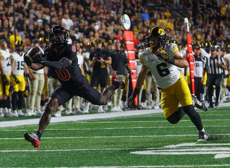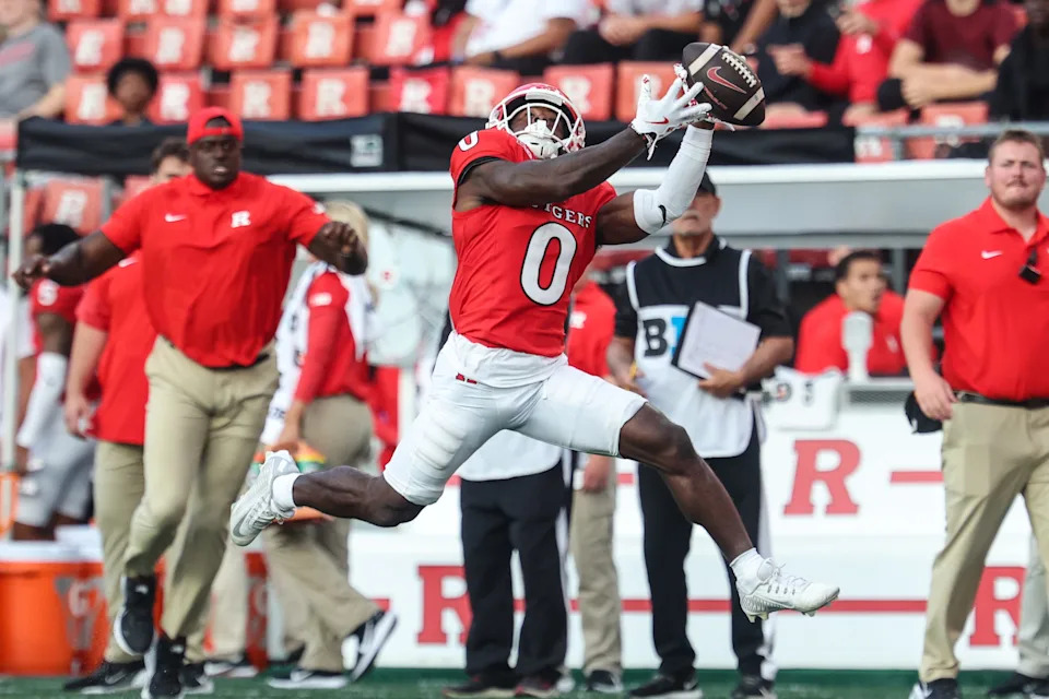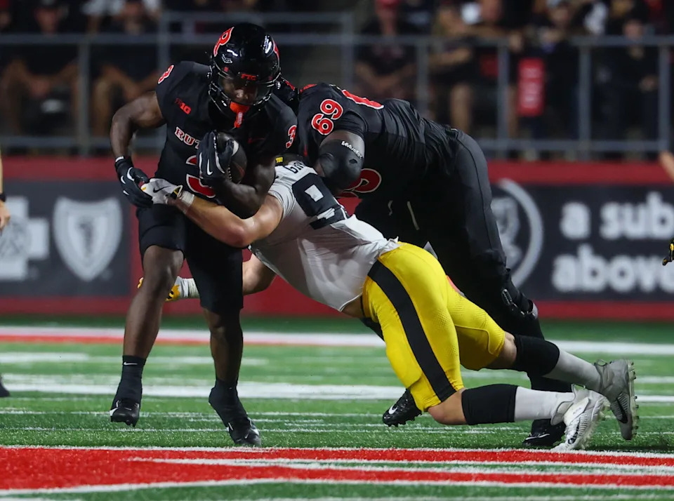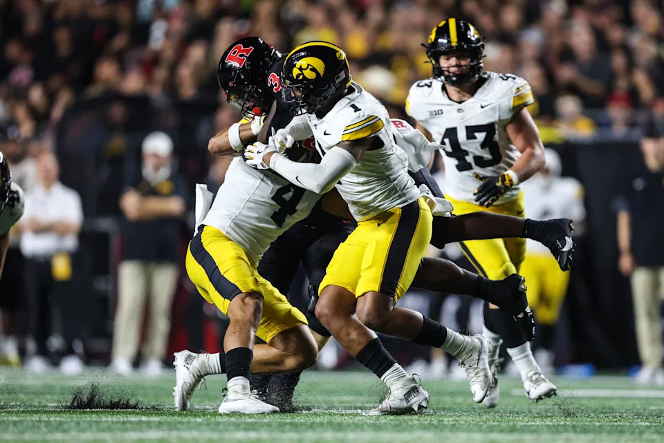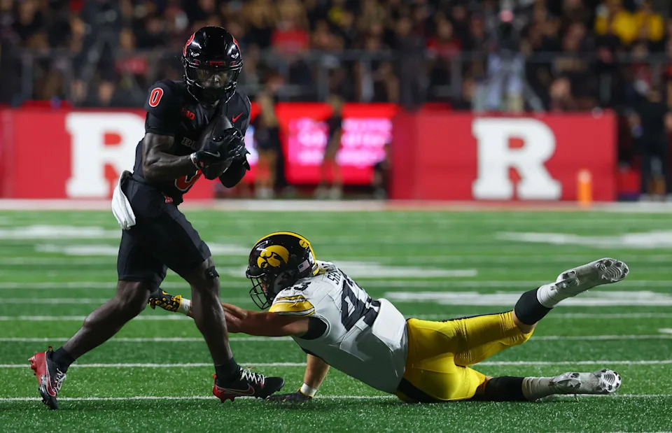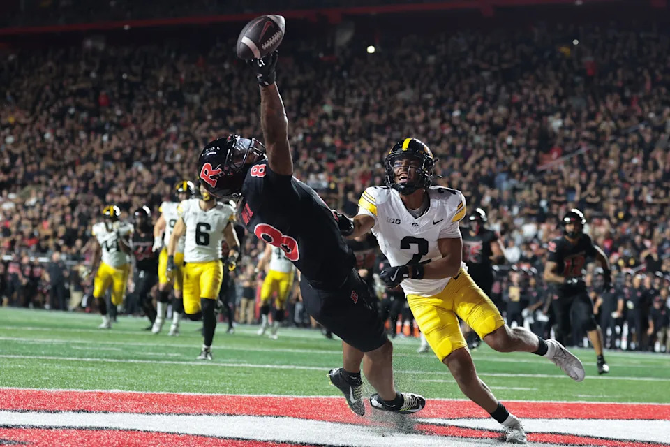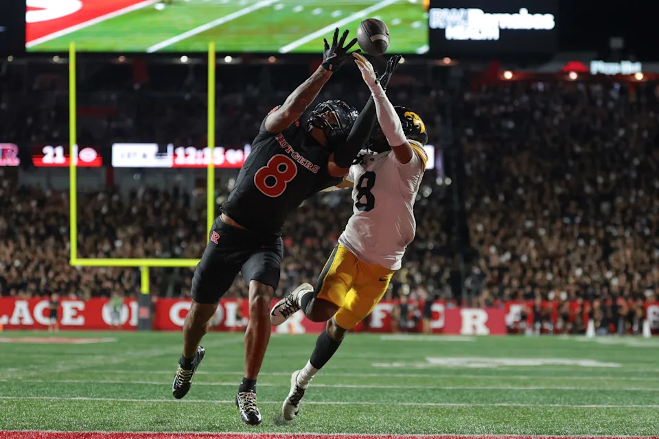 PISCATAWAY, NEW JERSEY – SEPTEMBER 19: DT Sheffield #0 of the Rutgers Scarlet Knights catches a pass while being defended by Karson Sharar #43 of the Iowa Hawkeyes during the first half at SHI Stadium on September 19, 2025 in Piscataway, New Jersey. (Photo by Ed Mulholland/Getty Images)