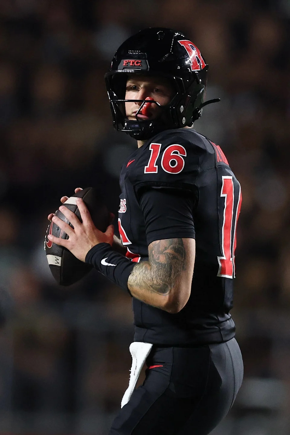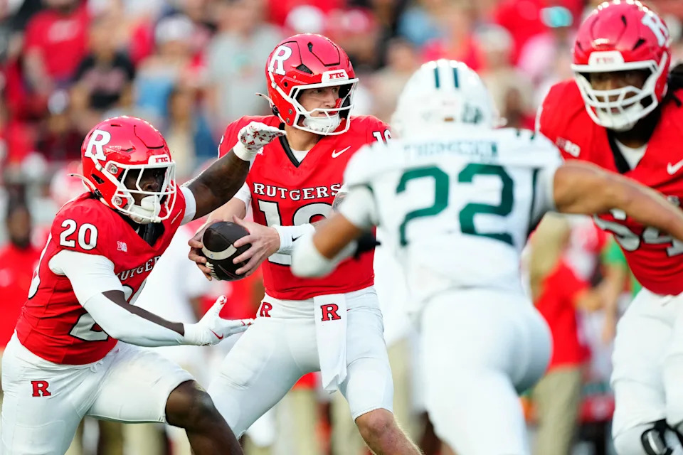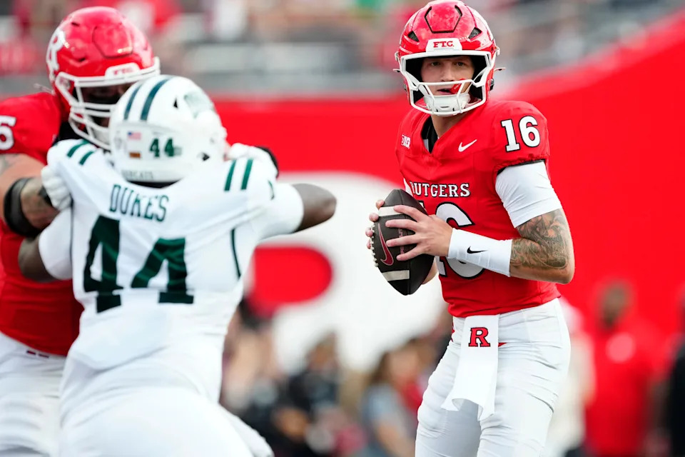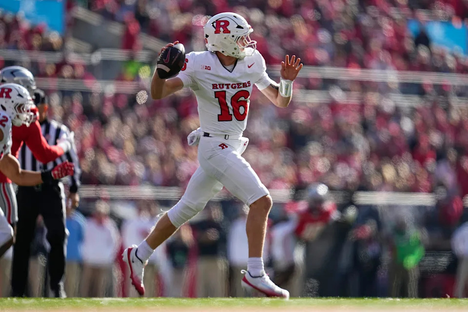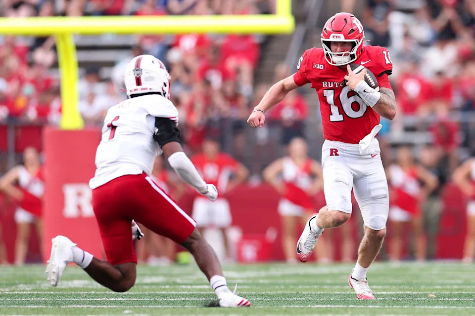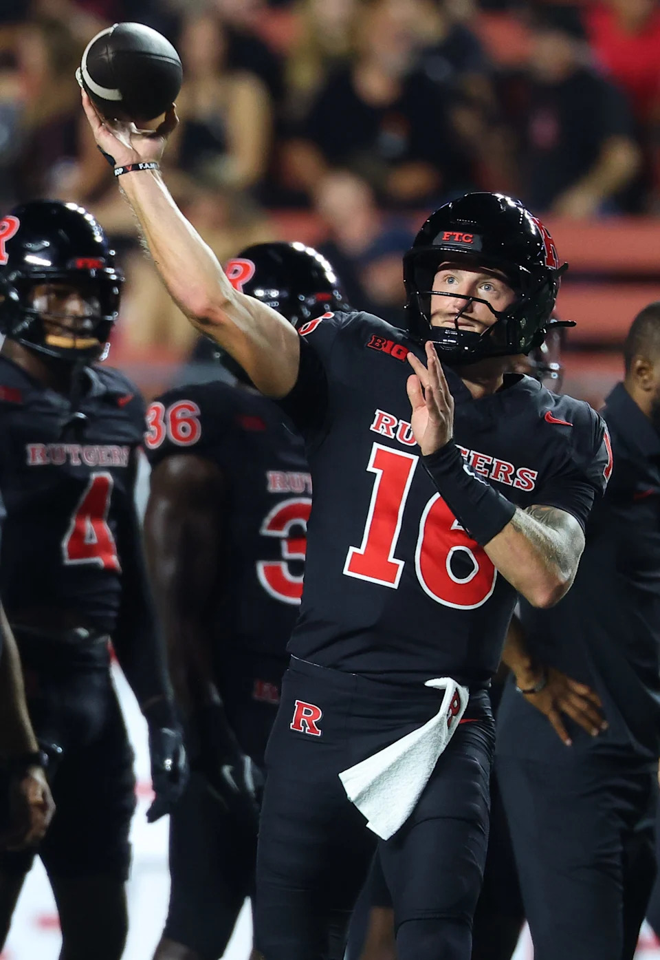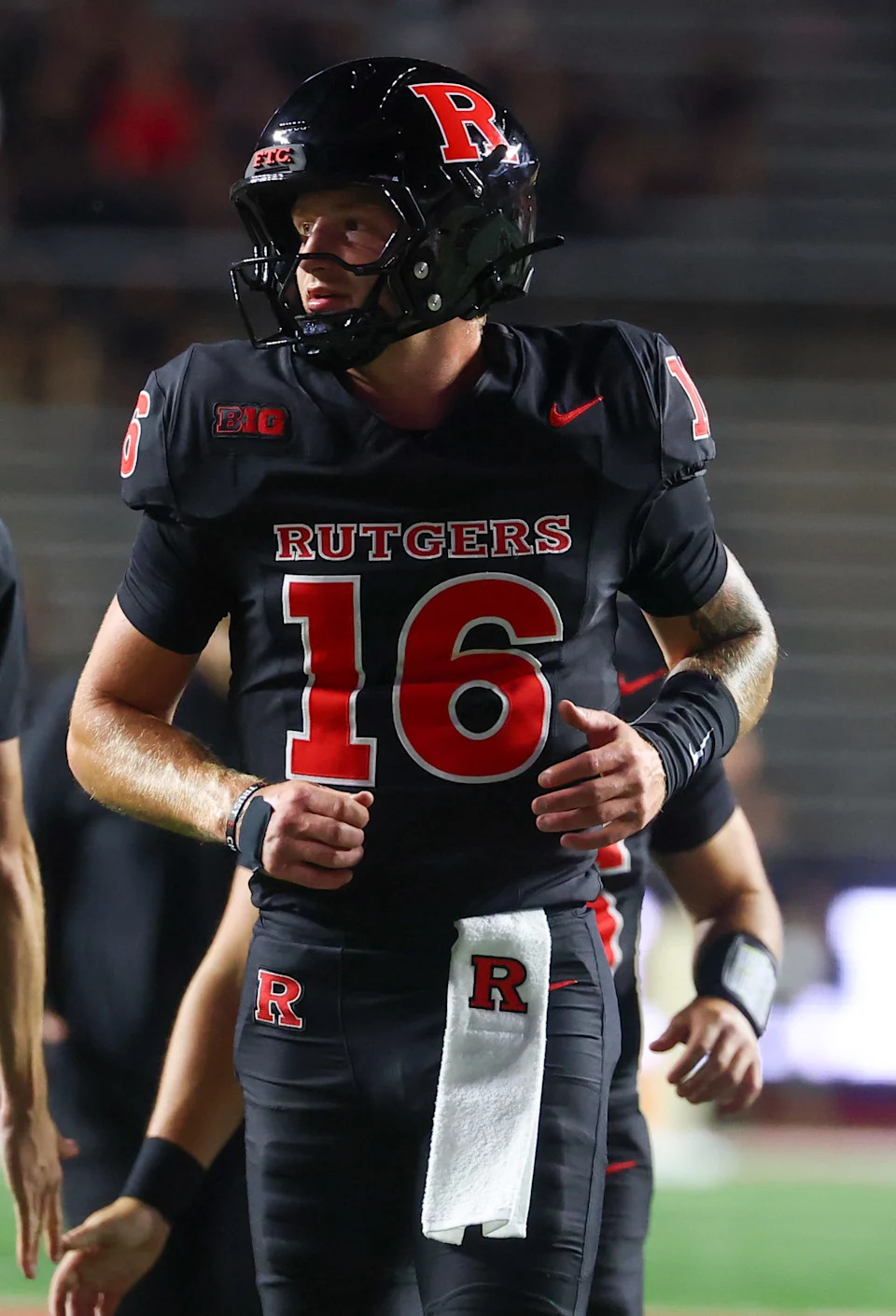 PISCATAWAY, NEW JERSEY – SEPTEMBER 19: Athan Kaliakmanis #16 of the Rutgers Scarlet Knights during warmups for their game against the Iowa Hawkeyes at SHI Stadium on September 19, 2025 in Piscataway, New Jersey. (Photo by Ed Mulholland/Getty Images)