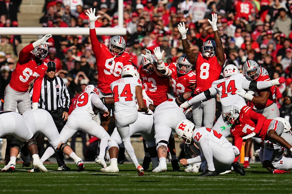 Rutgers Scarlet Knights kicker Jai Patel (44) kicks a field goal during the first half of the NCAA football game against the Ohio State Buckeyes at Ohio Stadium in Columbus on Nov. 22, 2025.
