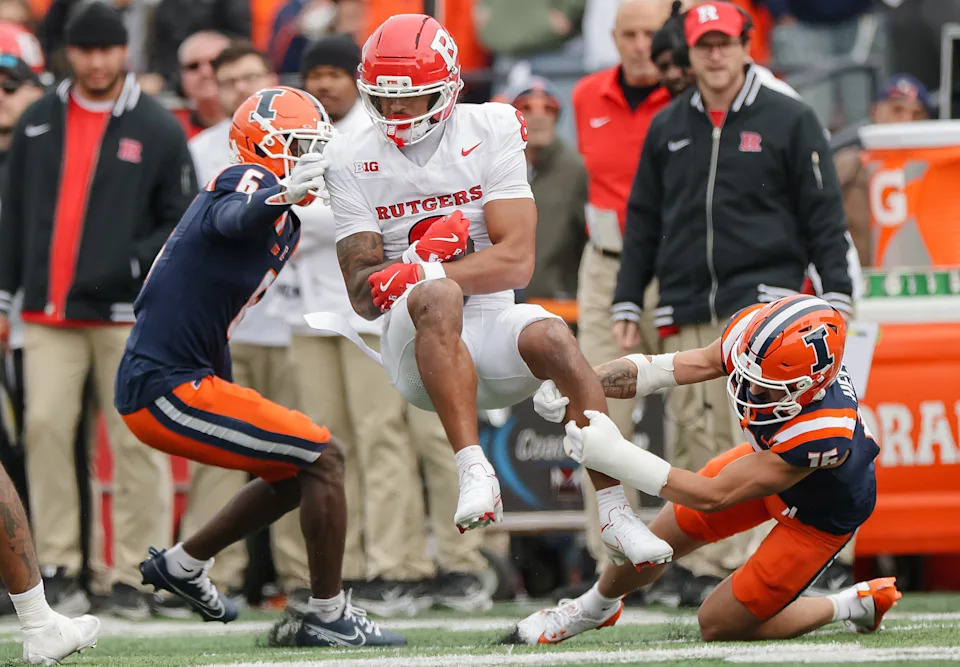 CHAMPAIGN, ILLINOIS – NOVEMBER 1: Kj Duff #8 of the Rutgers Scarlet Knights is tackled by Tanner Heckel #16 of the Illinois Fighting Illini during the first half of the NCAA football game Illinois Fighting Illini vs Rutgers Scarlet Knights at Memorial Stadium on November 1, 2025 in Champaign, Illinois. (Photo by Michael Hickey/Getty Images)