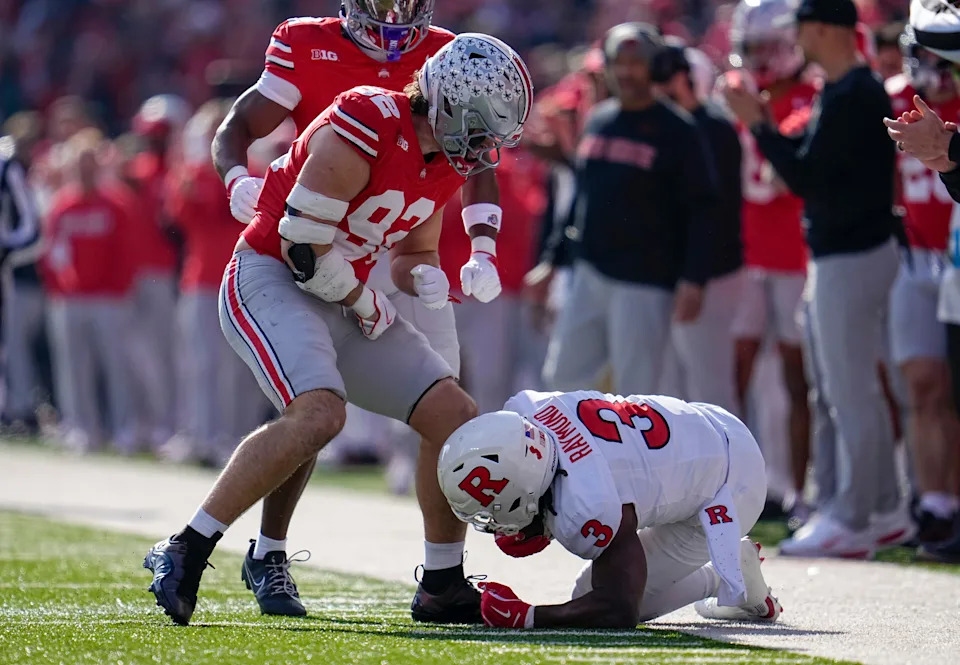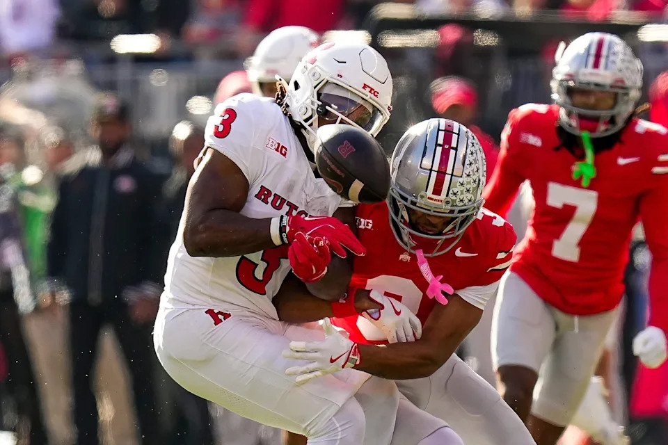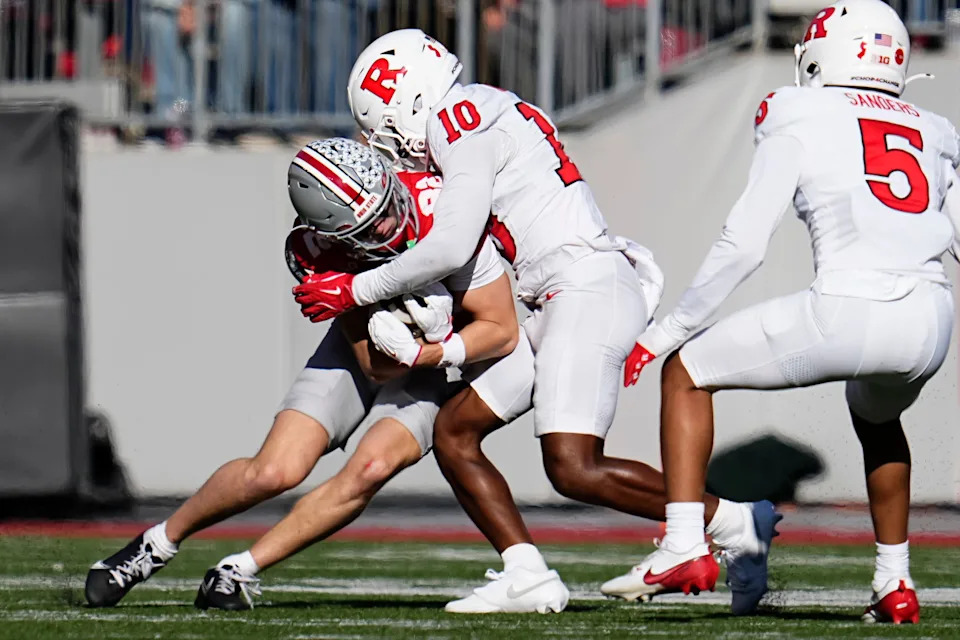 Ohio State Buckeyes cornerback Lorenzo Styles Jr. (3) hits Rutgers Scarlet Knights running back Antwan Raymond (3) in the first half of the NCAA football game at Ohio Stadium on Saturday, Nov. 22, 2025 in Columbus, Ohio.