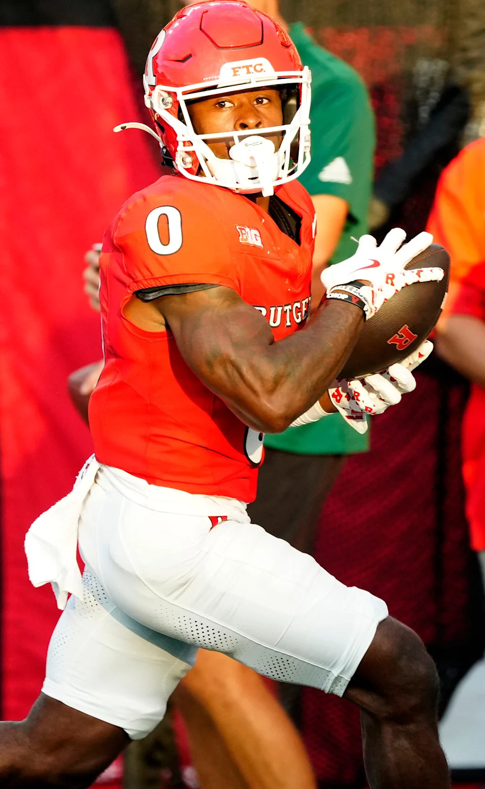 Rutgers Scarlet Knights wide receiver DT Sheffield (0) runs for a touchdown after completing a pass, Thursday, August 28, 2025.