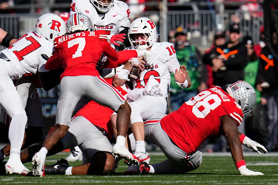 A slew of Ohio State Buckeyes sack Rutgers Scarlet Knights quarterback Athan Kaliakmanis (16) during the first half of the NCAA football game at Ohio Stadium in Columbus on Nov. 22, 2025.