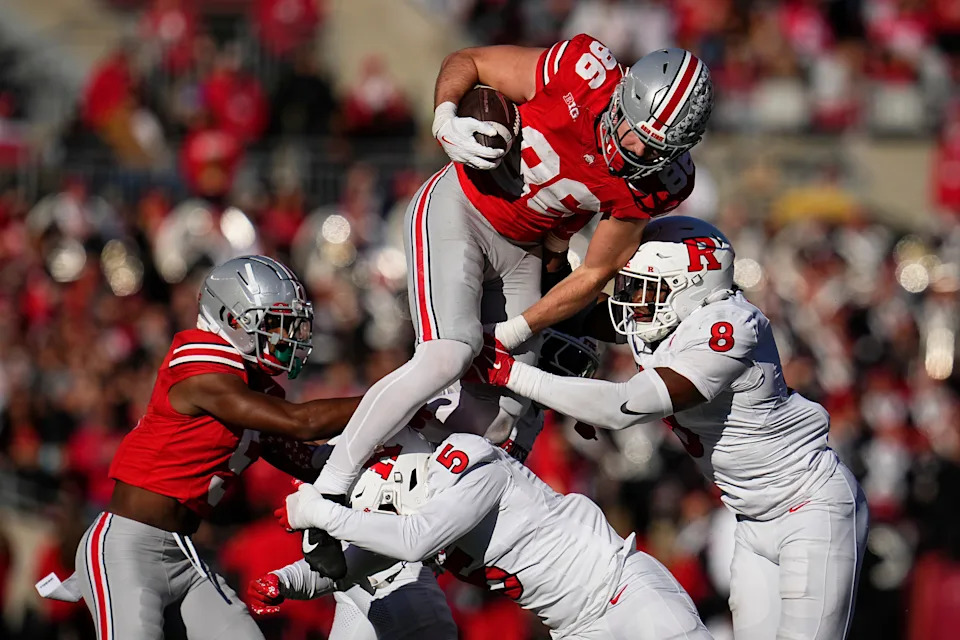 Ohio State Buckeyes tight end Max Klare (86) hurdles Rutgers Scarlet Knights defensive back Bo Mascoe (3), defensive back Kaj Sanders (5) and linebacker Dariel Djabome (8) during the second half of the NCAA football game at Ohio Stadium in Columbus on Nov. 22, 2025. Ohio State won 42-9.