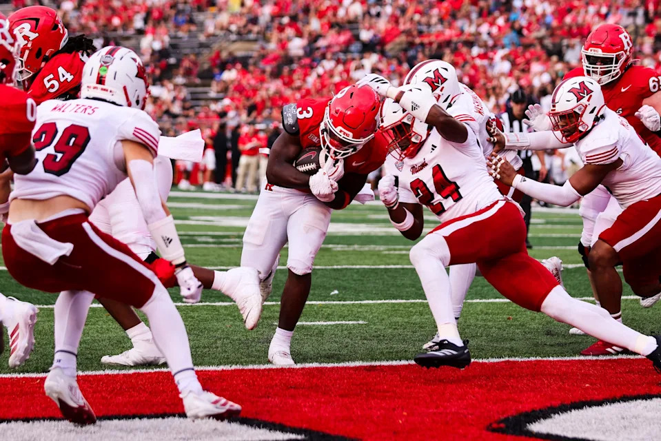 Rutgers football RB Antwan Raymond scores a touchdown during the Scarlet Knights’ game against Miami (Ohio) on Sept. 6, 2025 at SHI Stadium in Piscataway, N.J.