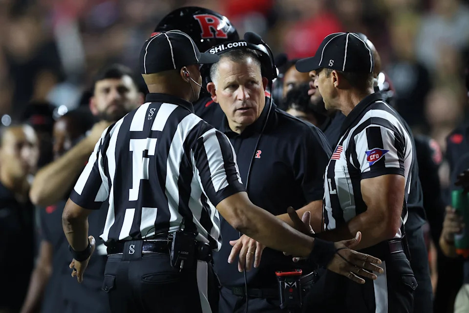 Sep 19, 2025; Piscataway, New Jersey, USA; Rutgers Scarlet Knights head coach Greg Schiano talks with officials during the first half against the Iowa Hawkeyes at SHI Stadium. Mandatory Credit: Vincent Carchietta-Imagn Images