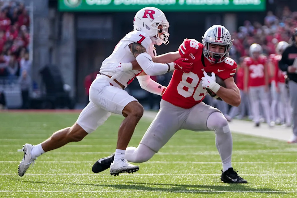 Ohio State Buckeyes tight end Max Klare (86) tries to run past Rutgers Scarlet Knights defensive back Cam Miller (7) during the NCAA football game at Ohio Stadium in Columbus on Nov. 22, 2025. Ohio State won 42-9.