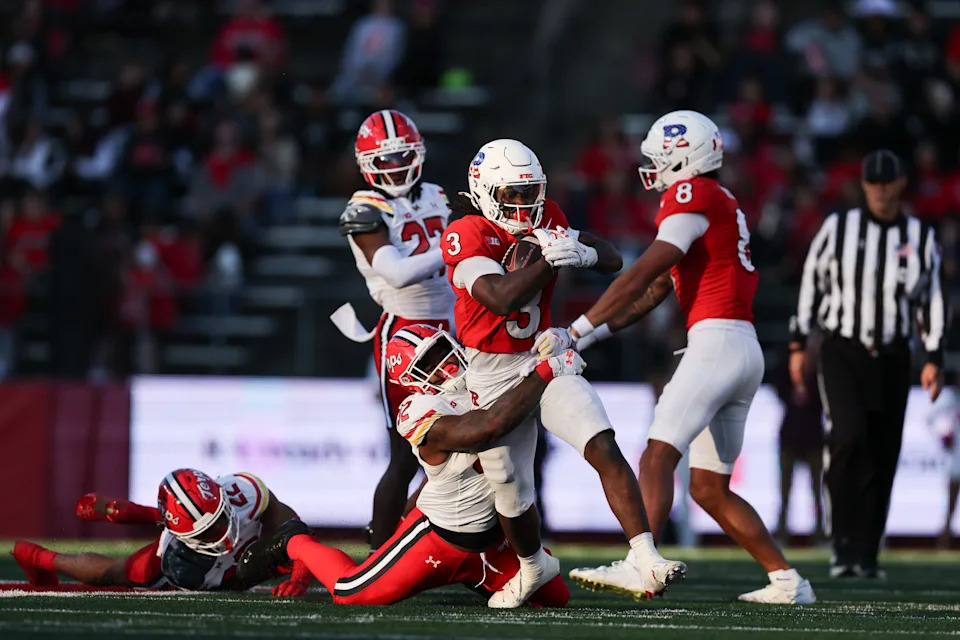 Nov 8, 2025; Piscataway, New Jersey, USA; Rutgers Scarlet Knights running back Antwan Raymond (3) fights for yards as Rutgers Scarlet Knights defensive lineman RJ Johnson Jr. (32) tackles during the first half at SHI Stadium. Mandatory Credit: Vincent Carchietta-Imagn Images