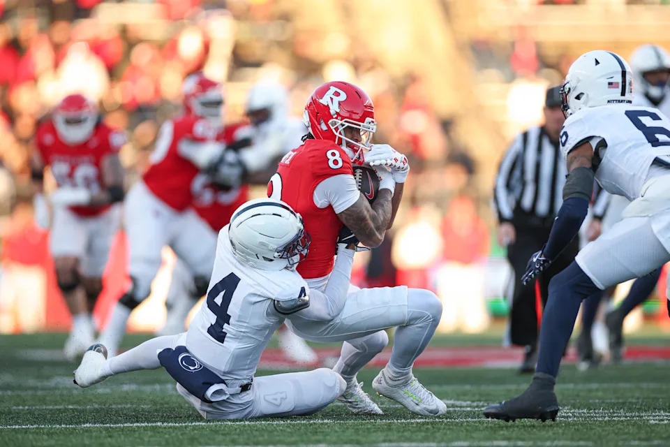 Nov 29, 2025; Piscataway, New Jersey, USA; Rutgers Scarlet Knights wide receiver Kj Duff (8) is tackled by Penn State Nittany Lions cornerback AJ Harris (4) during the first half at SHI Stadium. Mandatory Credit: Vincent Carchietta-Imagn Images