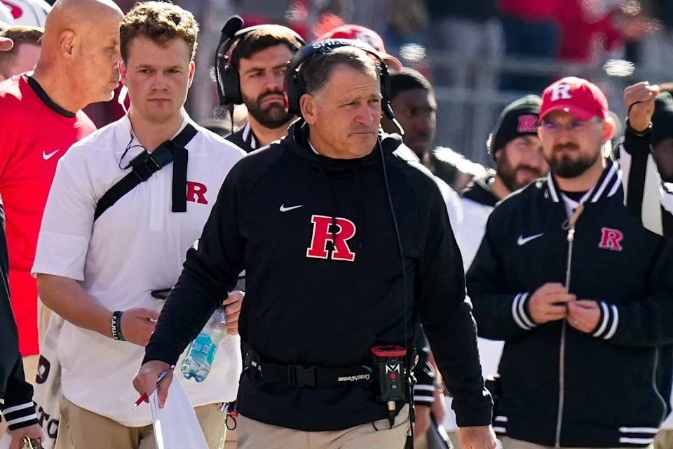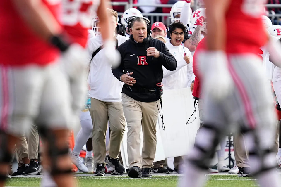 Rutgers Scarlet Knights head coach Greg Schiano watches from the sideline during the first half of the NCAA football game against the Ohio State Buckeyes at Ohio Stadium in Columbus on Nov. 22, 2025.