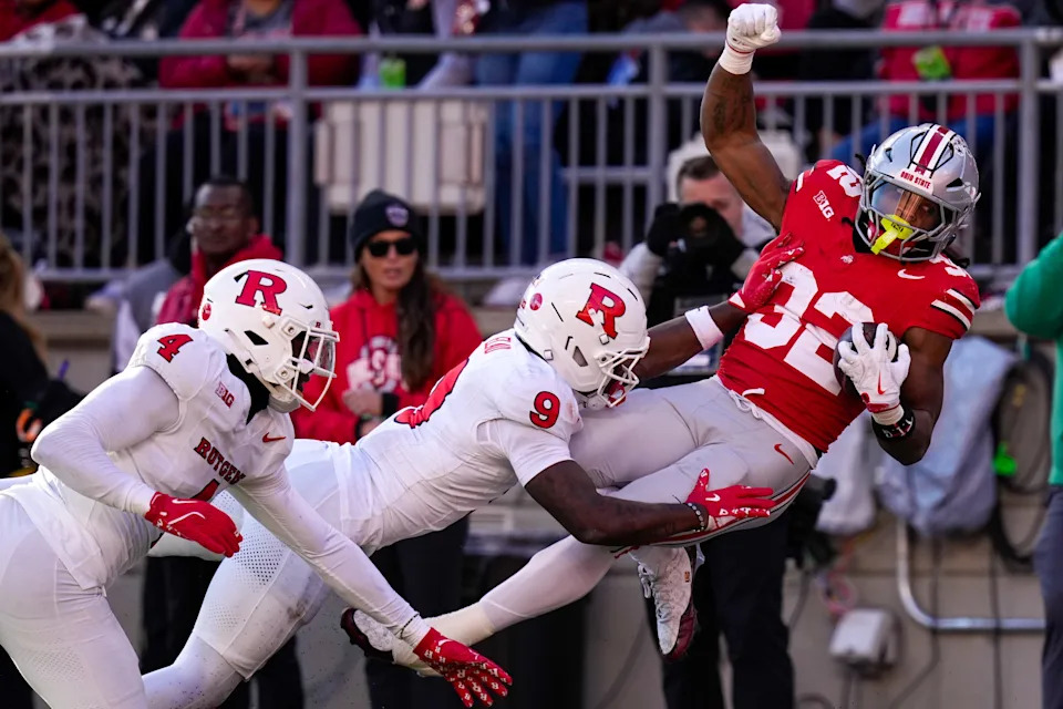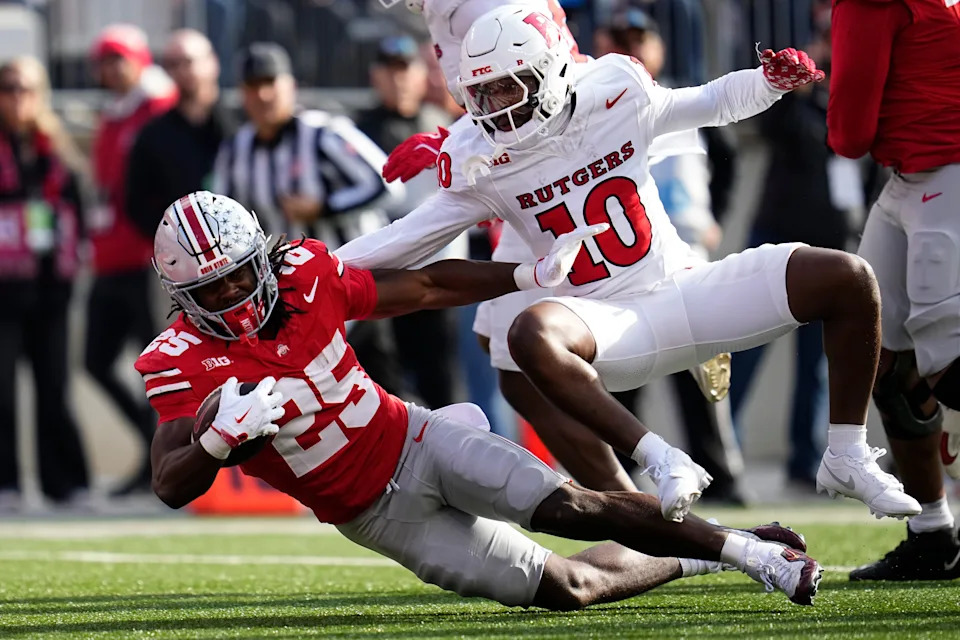 Ohio State Buckeyes running back Bo Jackson (25) reaches for the endzone under Rutgers Scarlet Knights defensive back Jacobie Henderson (10) during the first half of the NCAA football game at Ohio Stadium in Columbus on Nov. 22, 2025.