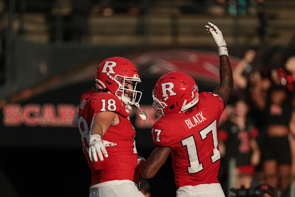 Sep 13, 2025; Piscataway, New Jersey, USA; Rutgers Scarlet Knights quarterback Rocco Rainone (17) celebrates his touchdown reception with tight end Colin Weber (18) during the second half against the Norfolk State Spartans at SHI Stadium. Mandatory Credit: Vincent Carchietta-Imagn Images