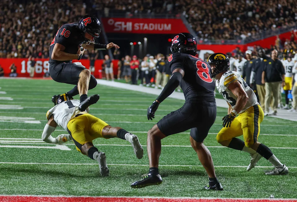 PISCATAWAY, NEW JERSEY – SEPTEMBER 19: Athan Kaliakmanis #16 of the Rutgers Scarlet Knights leaps over Xavier Nwankpa #1 of the Iowa Hawkeyes during the first half at SHI Stadium on September 19, 2025 in Piscataway, New Jersey. (Photo by Ed Mulholland/Getty Images)