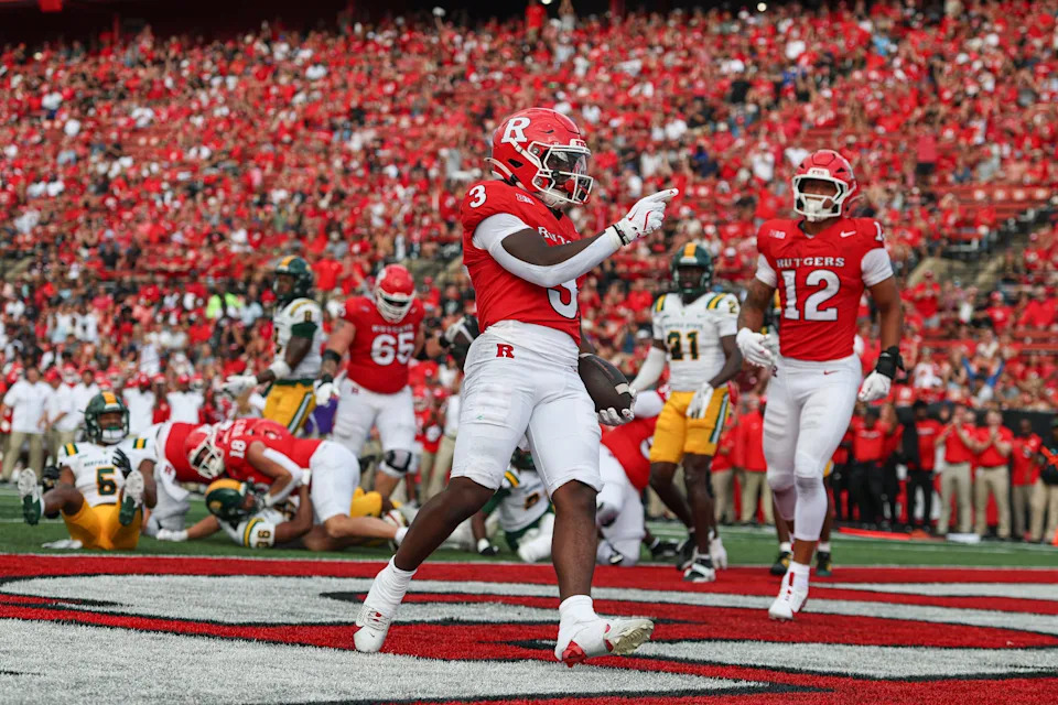 Sep 13, 2025; Piscataway, New Jersey, USA; Rutgers Scarlet Knights running back Antwan Raymond (3) scores a rushing touchdown during the first half against the Norfolk State Spartans at SHI Stadium. Mandatory Credit: Vincent Carchietta-Imagn Images