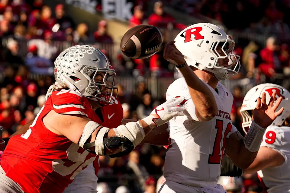 Ohio State Buckeyes defensive end Caden Curry (92) forces Rutgers Scarlet Knights quarterback Athan Kaliakmanis (16) to fumble to the ball in the second half of the NCAA football game at Ohio Stadium on Saturday, Nov. 22, 2025 in Columbus, Ohio.