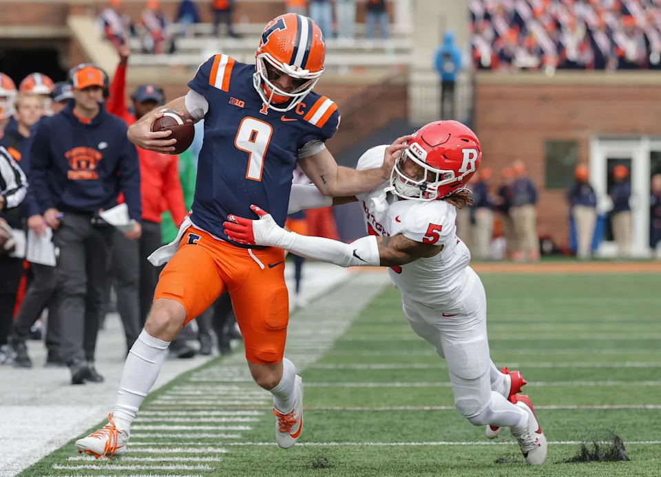 CHAMPAIGN, ILLINOIS – NOVEMBER 1: Luke Altmyer #9 of the Illinois Fighting Illini runs the ball against Kaj Sanders #5 of the Rutgers Scarlet Knights during the first half of the NCAA football game Illinois Fighting Illini vs Rutgers Scarlet Knights at Memorial Stadium on November 1, 2025 in Champaign, Illinois. (Photo by Michael Hickey/Getty Images)