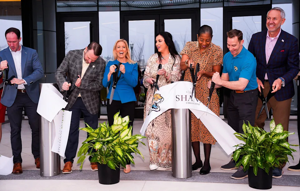 Jacksonville Councilman Joe Carlucci, left, President Kevin Carrico, second from left, all took part in the ribbon cutting festivities along with Jacksonville Mayor Donna Deegan and Shanna Khan, President, Khan Family Office; CEO and Chief Design Officer, Iguana Investments; Founder & CEO, Shanna Collective, third from left and City Council members Tyrona Clark-Murray, Jimmy Peluso and Chris Miller. The Jacksonville Jaguars opened their business operations office at One Tower Court, Wednesday March 25, 2026. The Jaguars’ 75,287-square-foot business operations occupy the building’s second through fourth floors. [Doug Engle/Florida Times-Union]