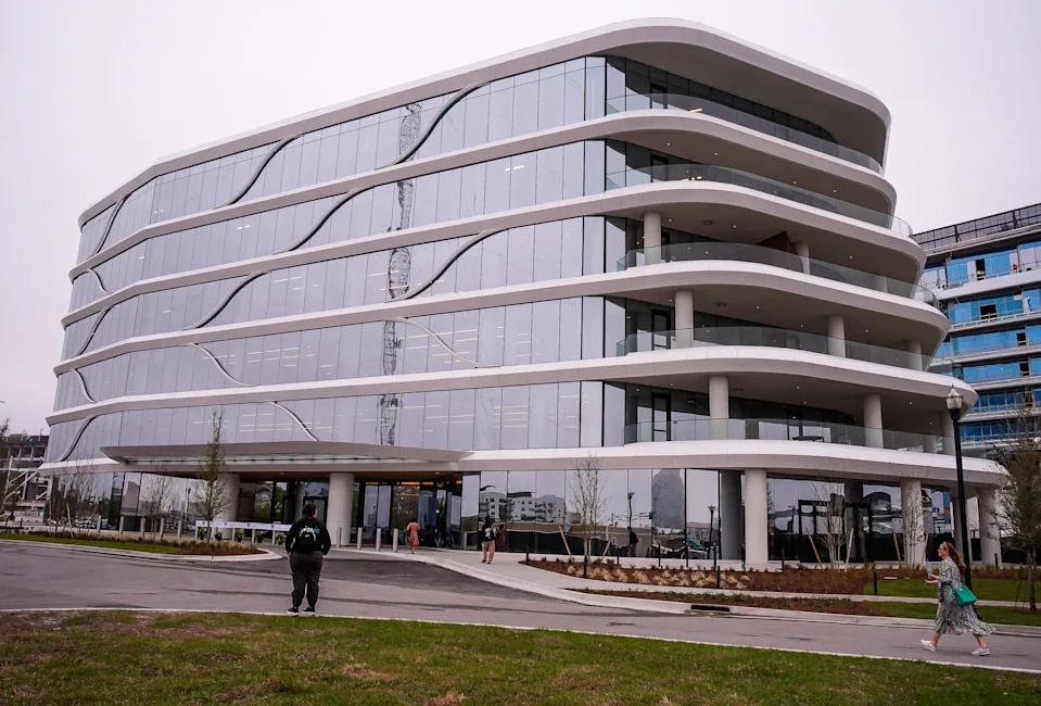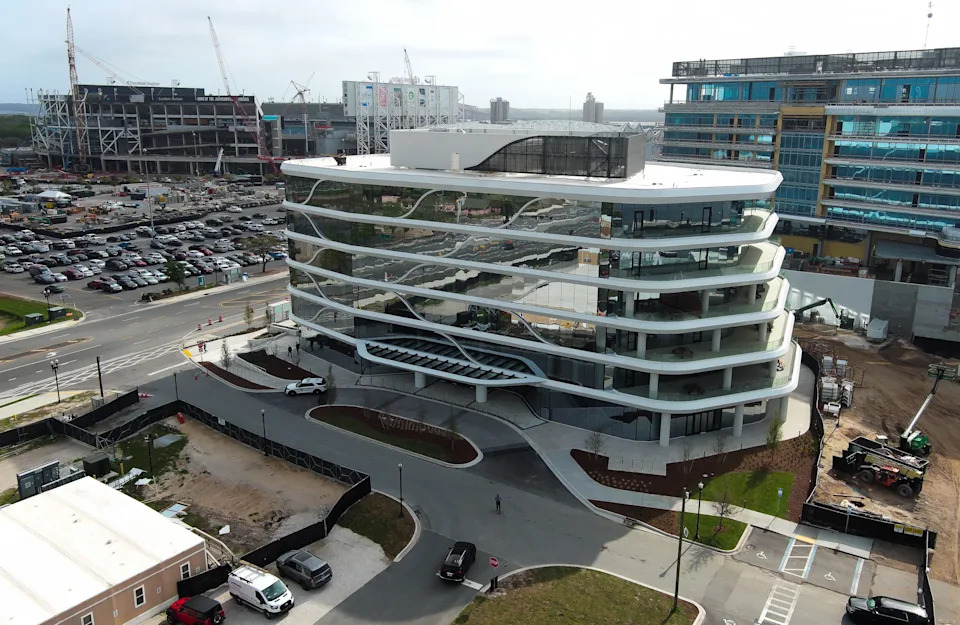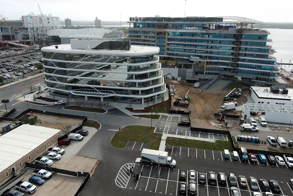 The Jacksonville Jaguars opened their business operations office at One Tower Court, Wednesday March 25, 2026, left. The Jaguars’ 75,287-square-foot business operations occupy the building’s second through fourth floors. The Four Seasons Hotel, right, is still under construction. [Doug Engle/Florida Times-Union]