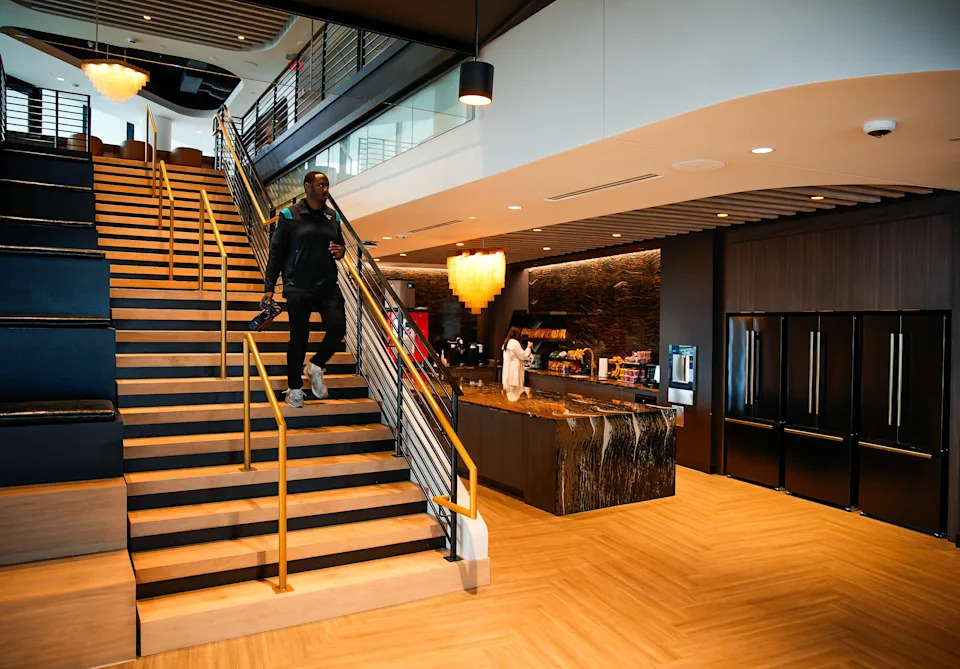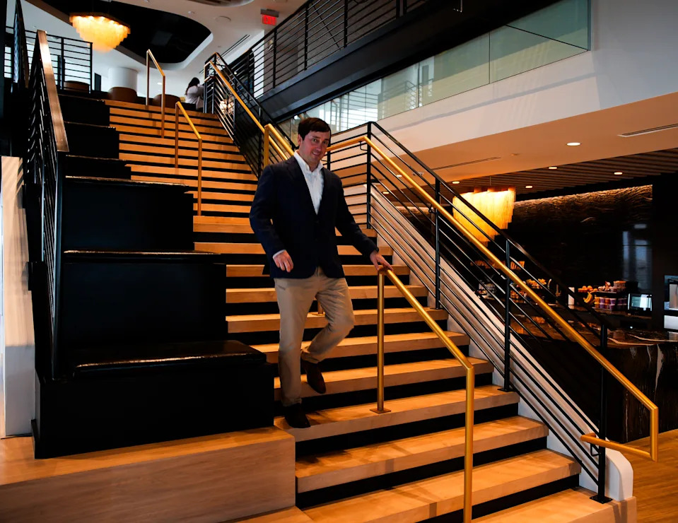 Jacksonville Jaguars David Paulk, assist manager of real estate development, comes down the staircase from the third flood of the Jaguars’ new business operations office at One Tower Court, Wednesday March 25, 2026. [Doug Engle/Florida Times-Union]