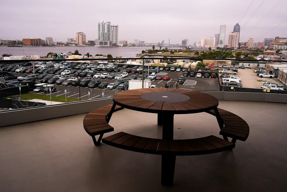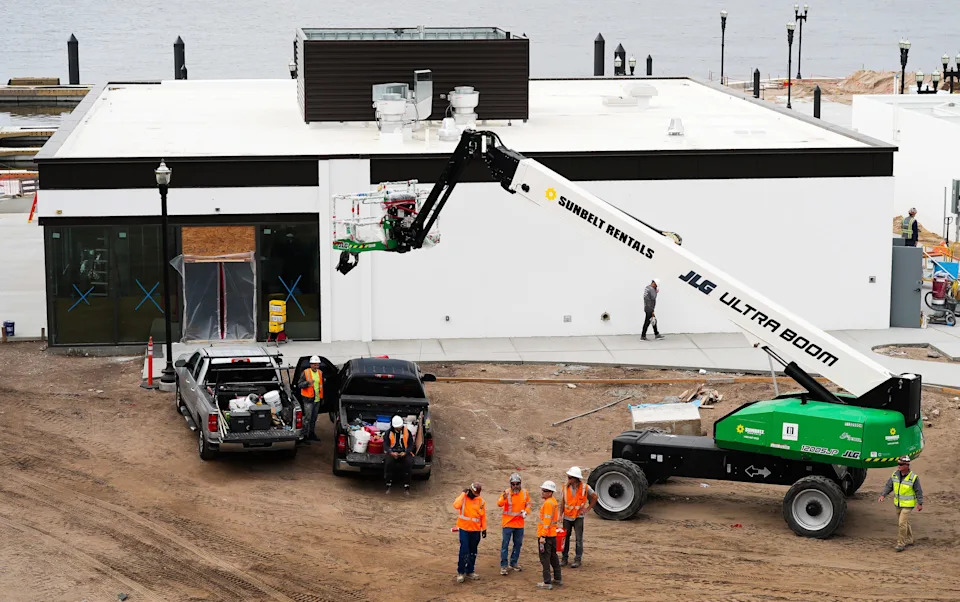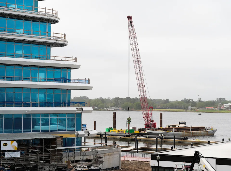 Construction workers look on at the restaurant Asado Life, a Argentinian live-fire restaurant that is opening in August 2026. It is located at the Jacksonville Shipyards marina, adjacent to the Four Seasons Hotel and Jacksonville Jaguars’ newly opened business operations office at One Tower Court, Wednesday March 25, 2026. [Doug Engle/Florida Times-Union]