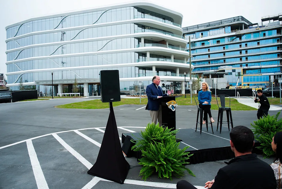 The Jacksonville Jaguars opened their business operations office at One Tower Court, Wednesday March 25, 2026, foreground, with a grand opening and ribbon cutting ceremony. [Doug Engle/Florida Times-Union]