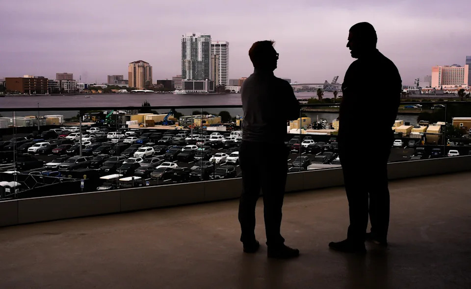 Two gentlemen take in view of the Jacksonville skyline on the third floor of the Jacksonville Jaguars’ newly opened business operations office at One Tower Court, Wednesday March 25, 2026 during a tour. [Doug Engle/Florida Times-Union]