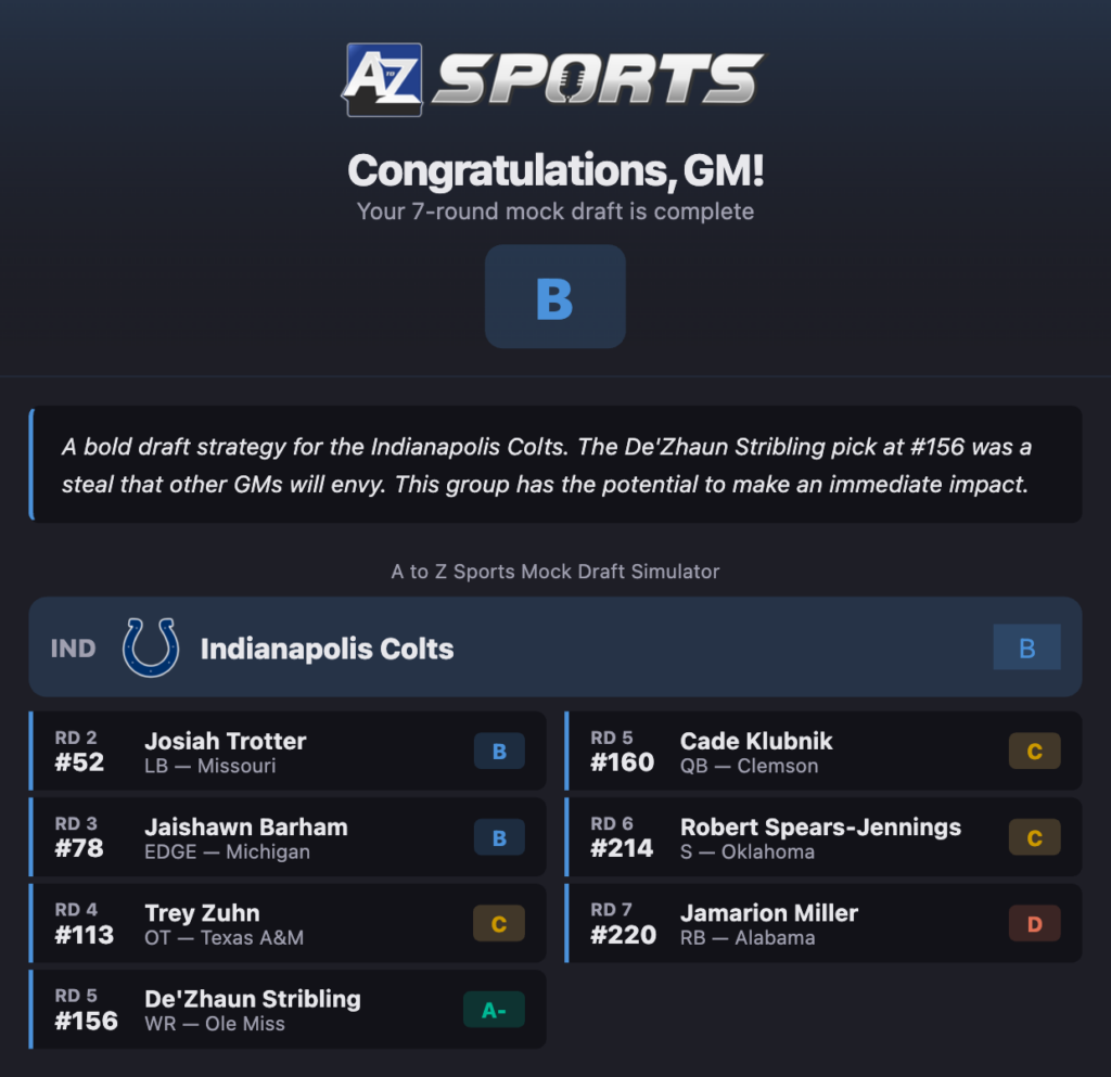 Colts 7 round 2026 NFL mock draft using A to Z Sports’ brand new mock draft simulator.