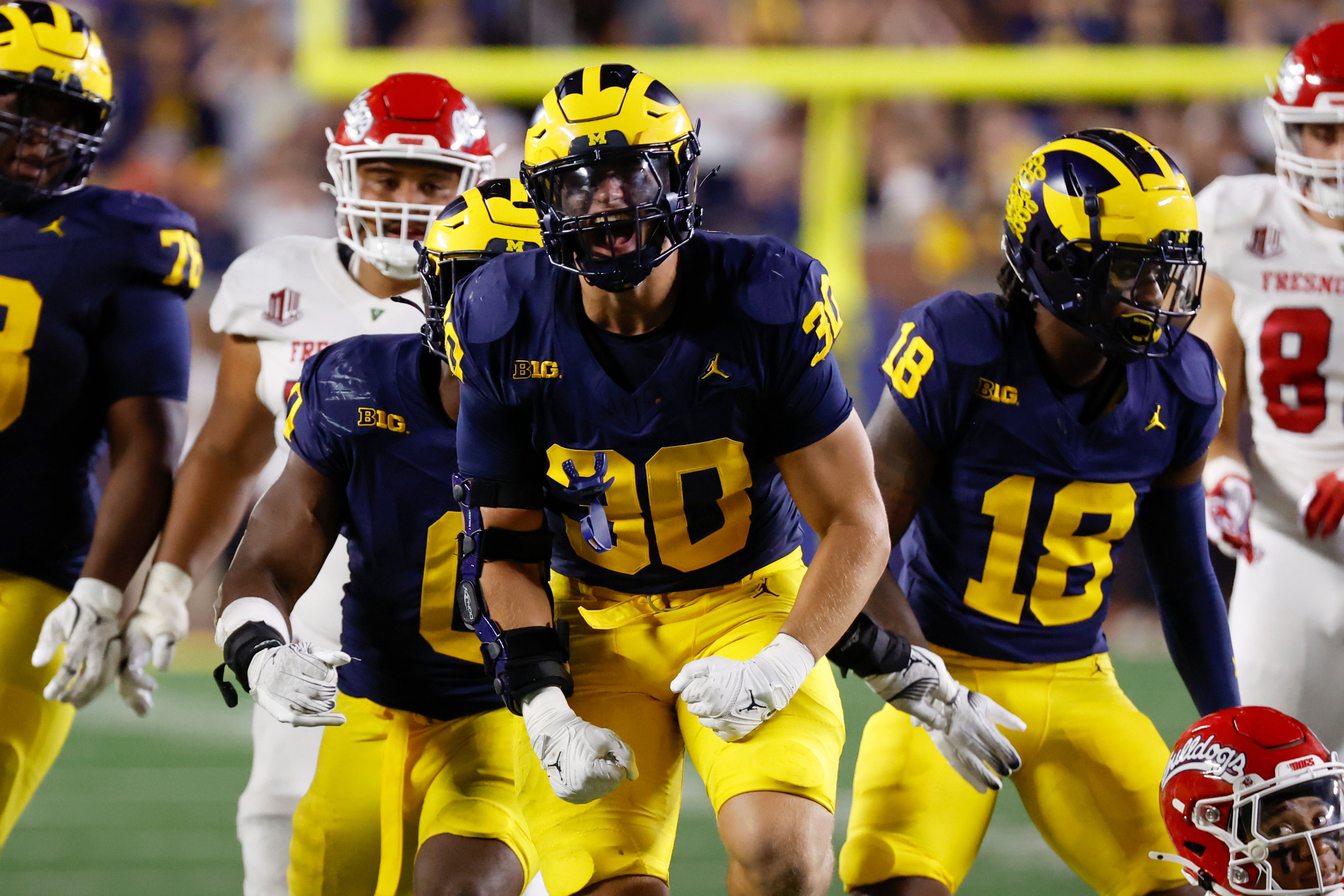 Michigan Wolverines linebacker Jimmy Rolder (30) celebrates a play in the second half against the Fresno State Bulldogs.