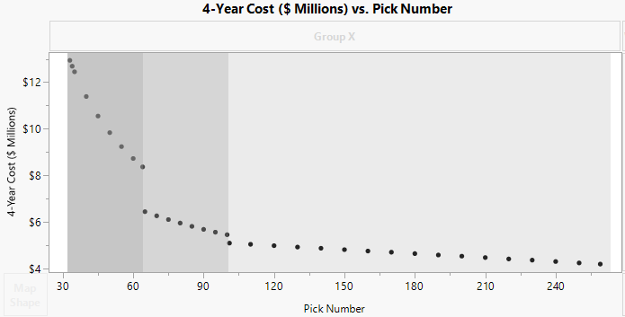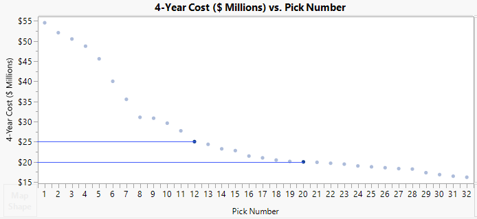 For the Cowboys’ current draft picks, the biggest impact comes from Day 1. By securing two first-round picks, Dallas has essentially added an extra guest to Thursday’s draft party. The vast majority of rookie draft expenses accrue in the opening round through massive signing bonuses and fully guaranteed salaries. Barring an additional draft day trade, the Cowboys will now have two of these larger expenses. The only silver lining from a cost perspective is that neither of these picks is a top-five selection, so they aren’t on the high end for first-rounders, but their picks will still come with a four-year cost of $25 million (pick 12) and $20 million (pick 20). Below shows the breakdown of four-year costs vs. pick for the first round.